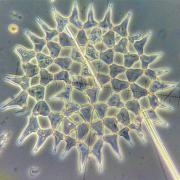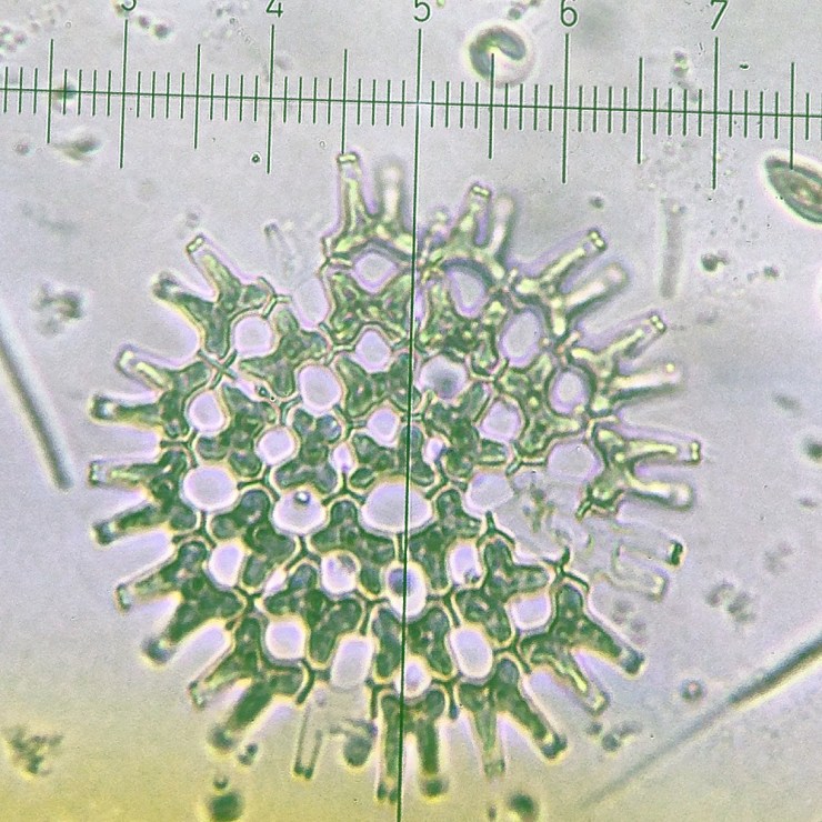 For example, in our reference, The Freshwater Algal Flora of the British Isles, Pediastrum duplex, has some of the following characteristics: Coenobia 35-135 (-212) micrometers across, with cells adjoining inter cellular spaces having concave side walls, and marginal cells 7-24 (-28)x 6-24 (-28) micrometers bearing short, cylindrical tapering truncate projections.