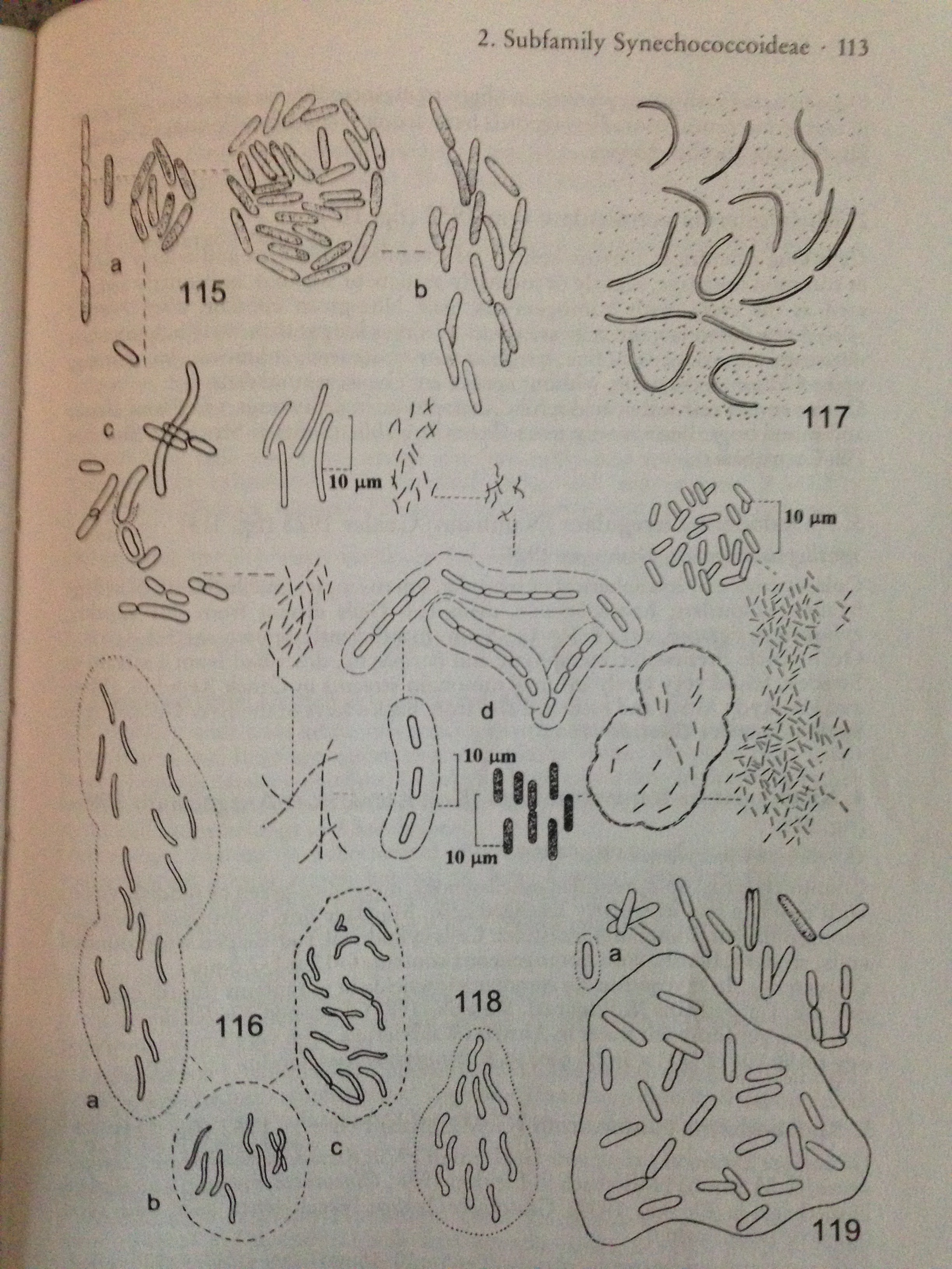 In the picture above, figures 115 and 116 are specifically Rhabdoderma lineare. Now seeing these figures, it is very plausible to see how one can confuse this with other genera such as Synechococcus.