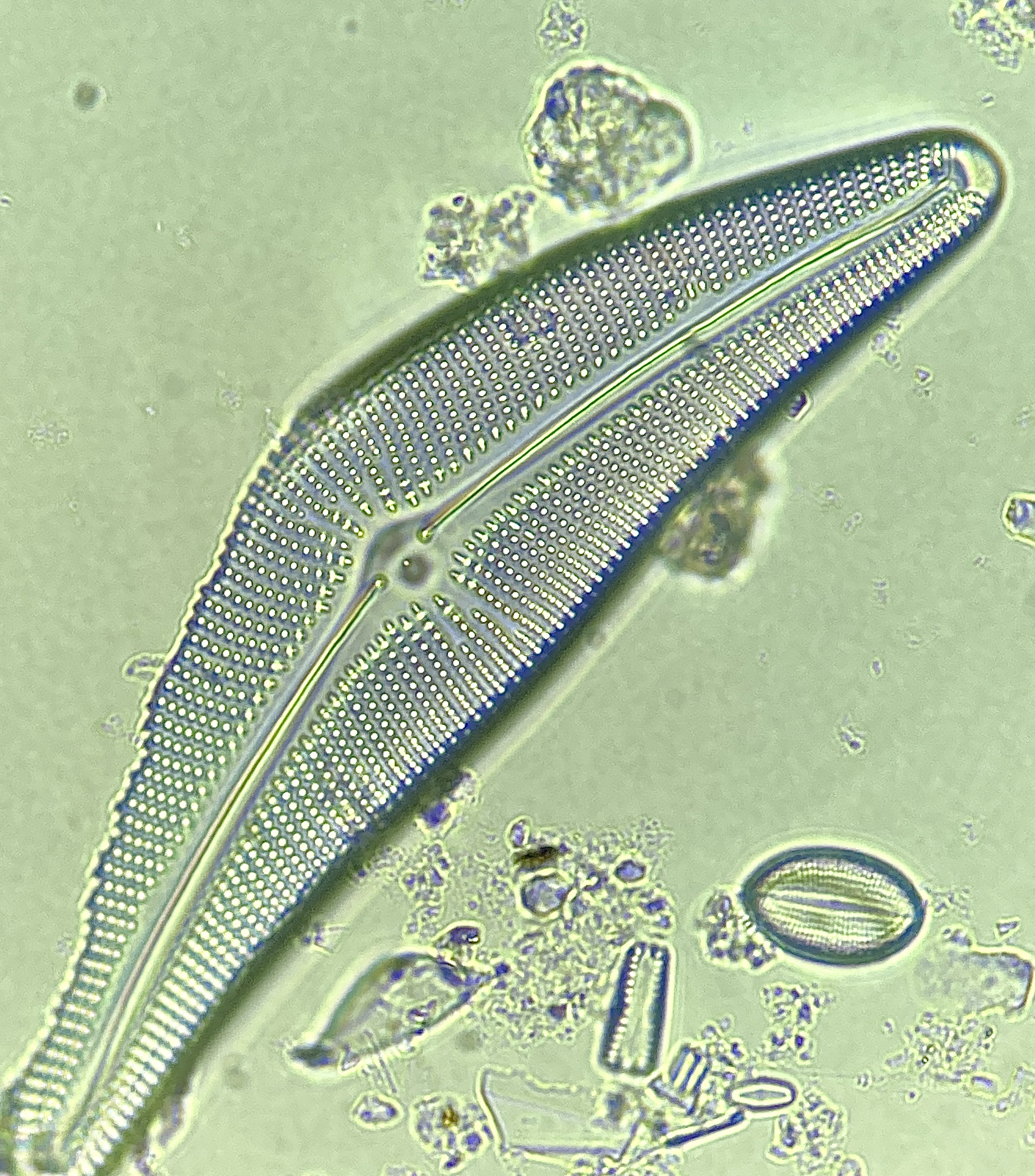Now, for those of you who are not familiar, this is a diatom in what is called “Valve View”. This is the preferred view to accurately speciate diatoms because the necessary characteristics are in plain view. Its also good to note that digested diatoms make it 1000% easier to speciate because you are viewing the organisms at 100x magnification using immersion oil.